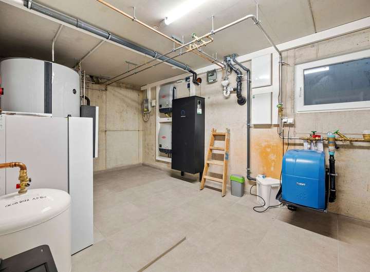 Im Keller befindet sich der Technikraum mit einer effizienten Wärmepumpe, Pufferspeicher, einer Wasserenthärtungsanlage sowie der kompletten Elektrik des Hauses und der Anlagentechnik für die PV-Anlage die übersichtlich und fachgerecht installiert wurde.