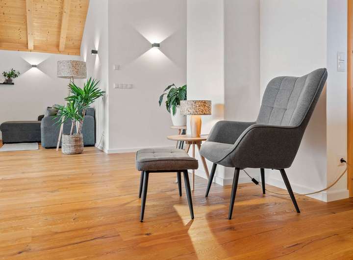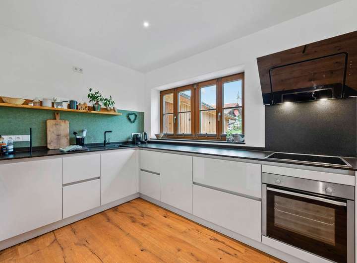 - Eichendielen in folgenden Räumen: Schlafzimmer, Flur innerhalb, Wohn-/Essbereich, Küche