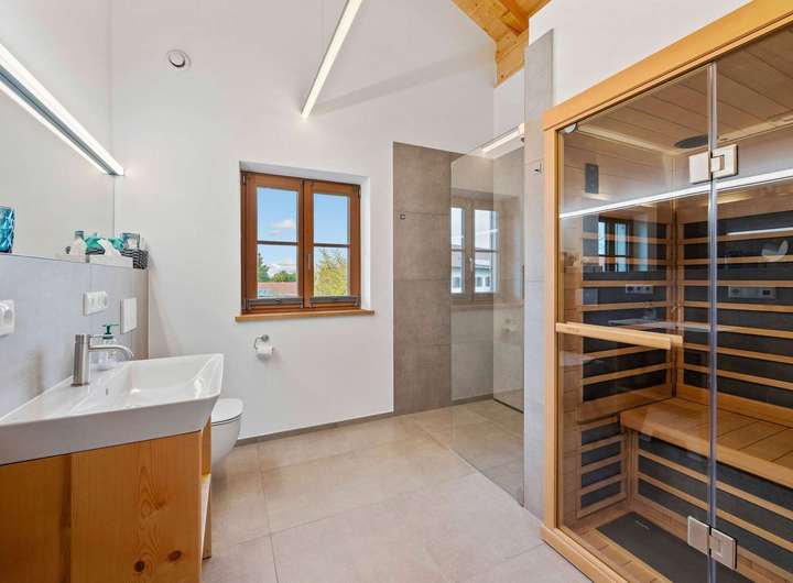 Die Innenräume sind mit eleganten Feinsteinzeug-Fliesen in den Bädern und dem Treppenhaus sowie hochwertigen Eichendielen in den Wohn- und Schlafräumen gestaltet. Ergänzt wird die Ausstattung durch massive Echtholz-Zimmertüren, maßgefertigte Schreiner-Fenster und einem sichtbaren Dachstuhl im Obergeschoss, der dem Raum ein großzügiges, warmes und charaktervolles Ambiente verleiht. Die gesamte Immobilie wurde mit viel Liebe zum Detail und einem hohen Anspruch an Qualität und Ästhetik gestaltet.