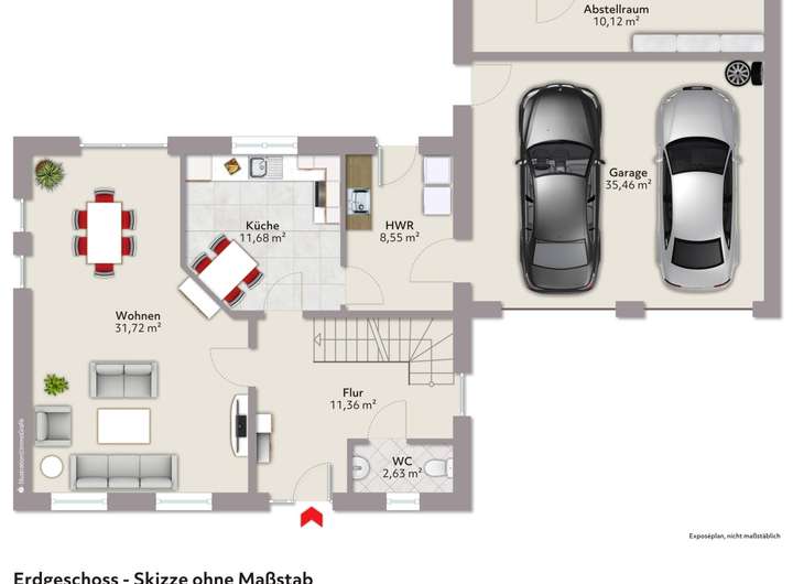 Im Erdgeschoss stehen Ihnen neben einem sehr großen und komfortablen Wohn- und Essbereich mit Zugang zur sonnigen Terrasse mit Markise, eine gemütliche Küche, ein großzügiger HWR, der zentrale Eingangsflur und ein Gäste-WC zur Verfügung.