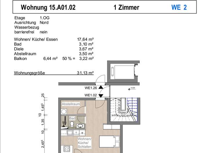 Die 1-Zimmer-Neubauwohnung mit Balkon hat ca.31,13 qm die sich wie folgt aufteilen: