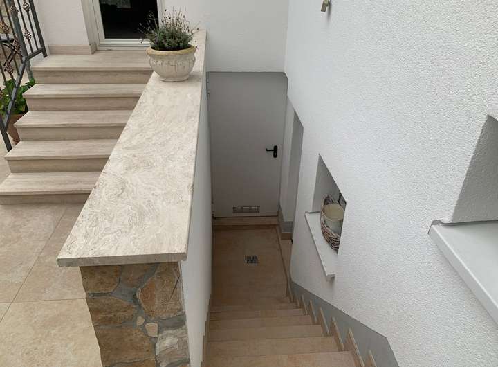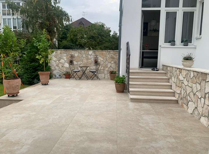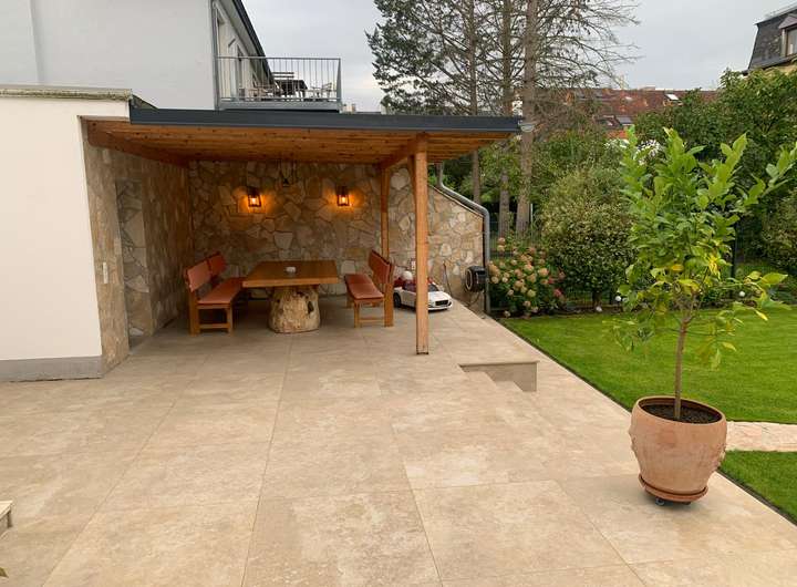 Große Terrasse mit hellen Fliesen