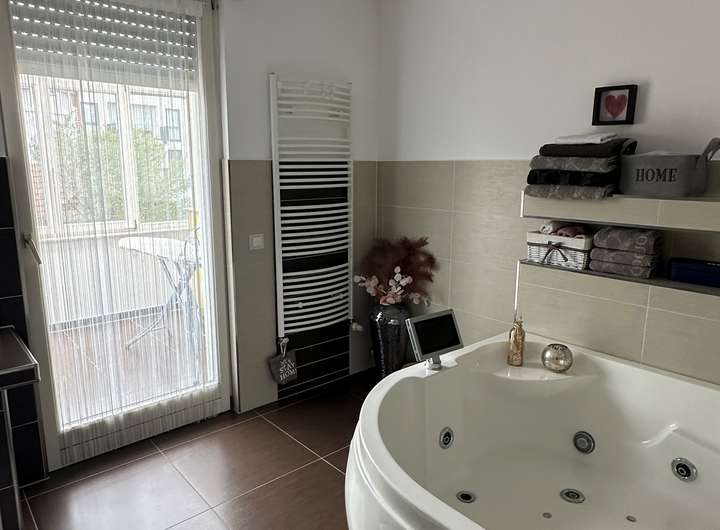 Luxuriöses Wellnessbad mit Whirlpool-Badewanne, Armaturen in Chrom