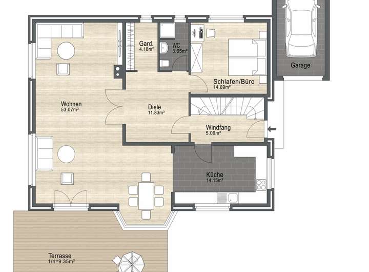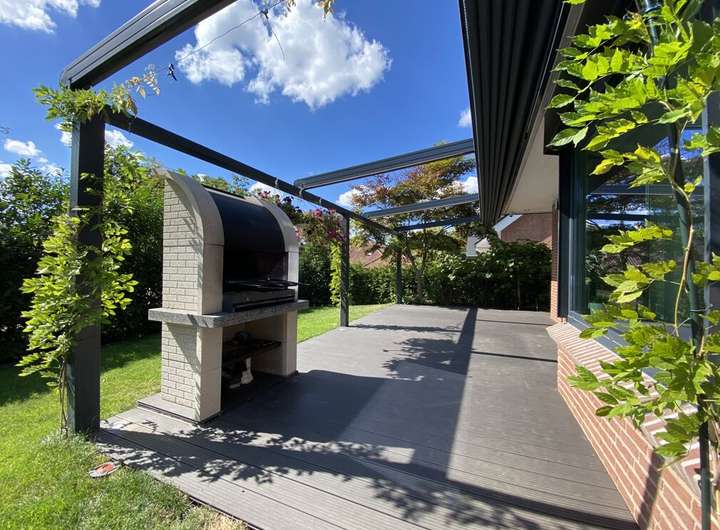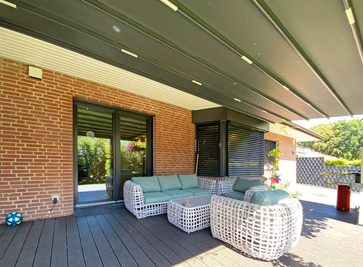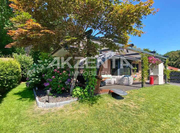 - Süd-Terrasse (ca. 35 m²) überdacht mit Elektrische Markise mit Lichtern und Innenbeleuchtung sowie Zugang zum pflegeleicht angelegten Garten