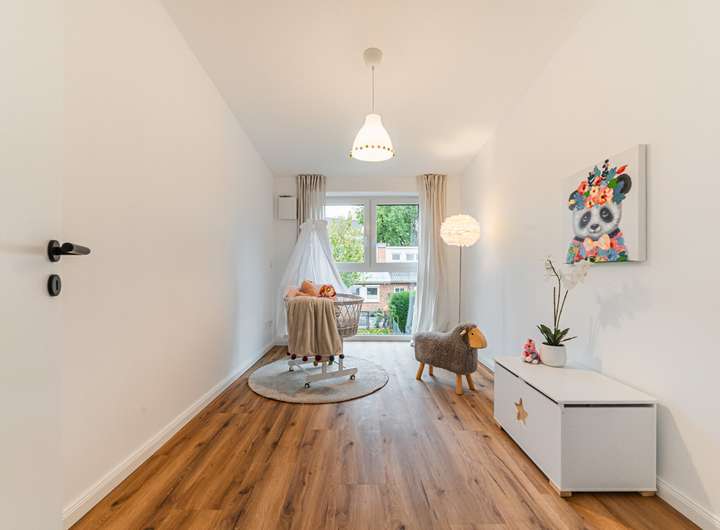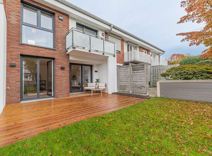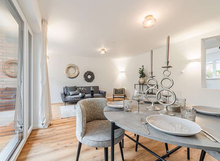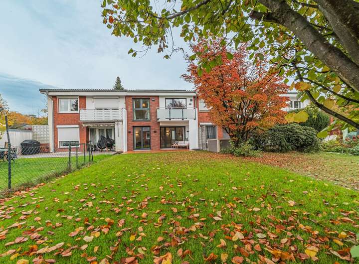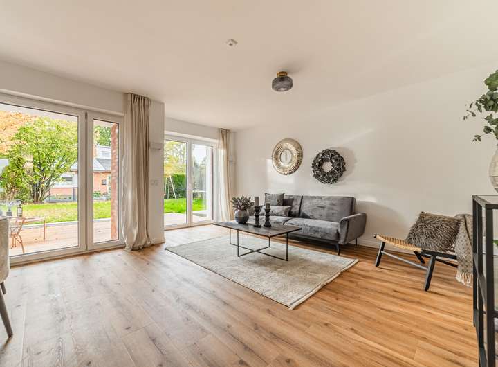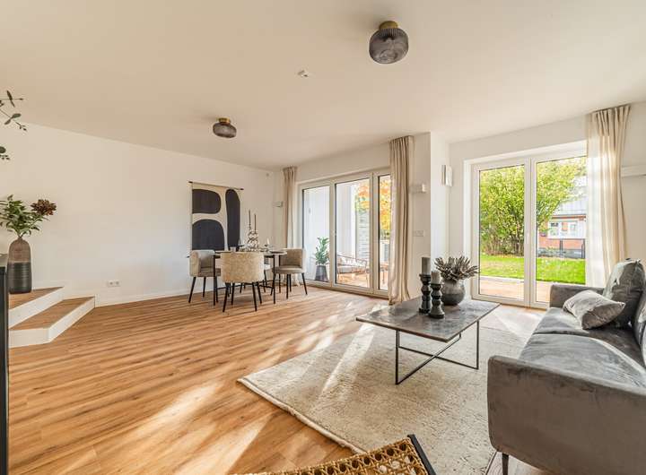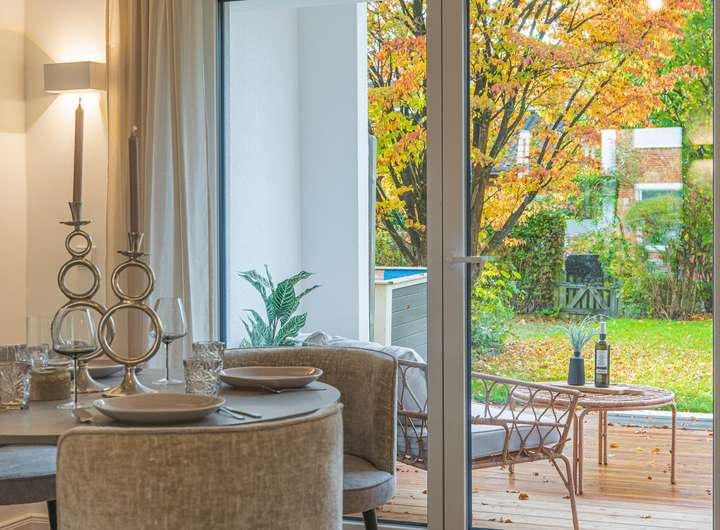 Im Wohnbereich öffnet sich der Raum weit zur sonnigen Terrasse in Südlage – Ihr ganz persönlicher Lieblingsplatz für den ersten Kaffee am Morgen oder ein Glas Wein am Abend. Hier hört man nichts außer das Rascheln der Blätter und das Zwitschern der Vögel und dennoch ist man mitten in Hamburg.