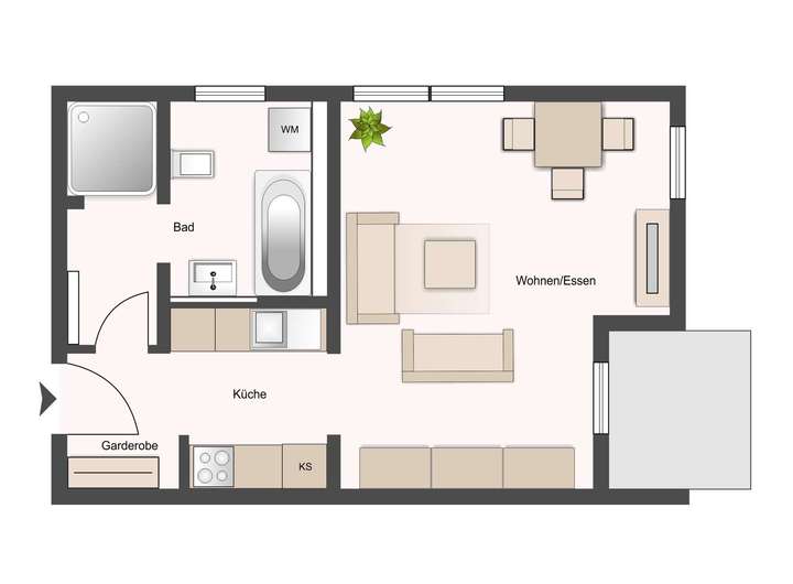 Beim Betreten dieser schönen Erdgeschosswohnung fällt sofort der offene, lichtdurchflutete Grundriss der Wohnung auf. Gerade zu kommen Sie über die praktisch eingebaute Küche in den offenen Wohn- und Essbereich mit Zugang zur Terrasse. Eine schöne Südterrasse lädt zum Entspannen in der warmen Sonne ein.