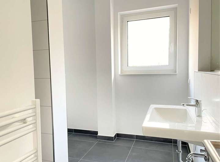 Mit viel Platz neben Dusche und Badewanne ist das Tageslichtbad eine absolute Wohlfühloase. Dunkle Bodenfliesen werden mit hellen Bodenfliesen für einen modernen Look kombiniert. In dieser Wohnung verbindet sich Moderne mit idyllischer Natur.
