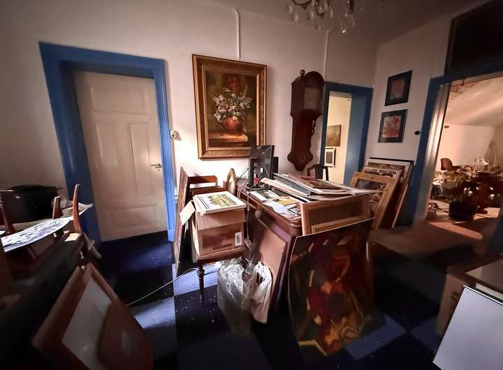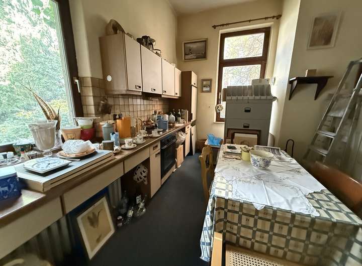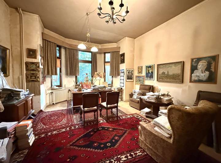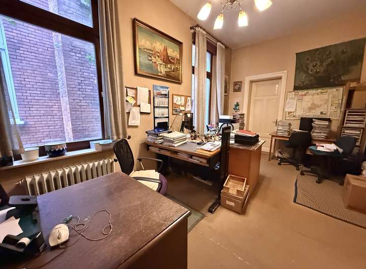 Im Erdgeschoss befindet sich eine gewerbliche Einheit, die sich hervorragend als Büro, Praxis oder kleines Ladenlokal nutzen lässt. Die oberen Etagen beherbergen helle, großzügig geschnittene Wohnräume mit typischen Altbaudetails – hohe Decken, Holzdielen und originale Elemente prägen das Ambiente.