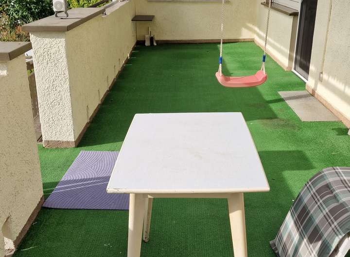 - große Terrasse mit kleiner Treppe in den Garten