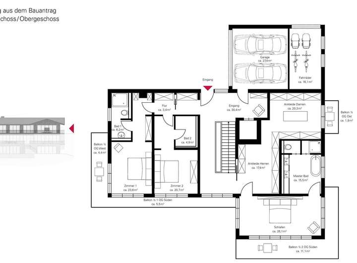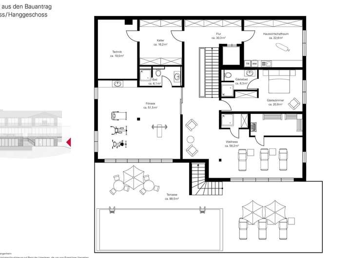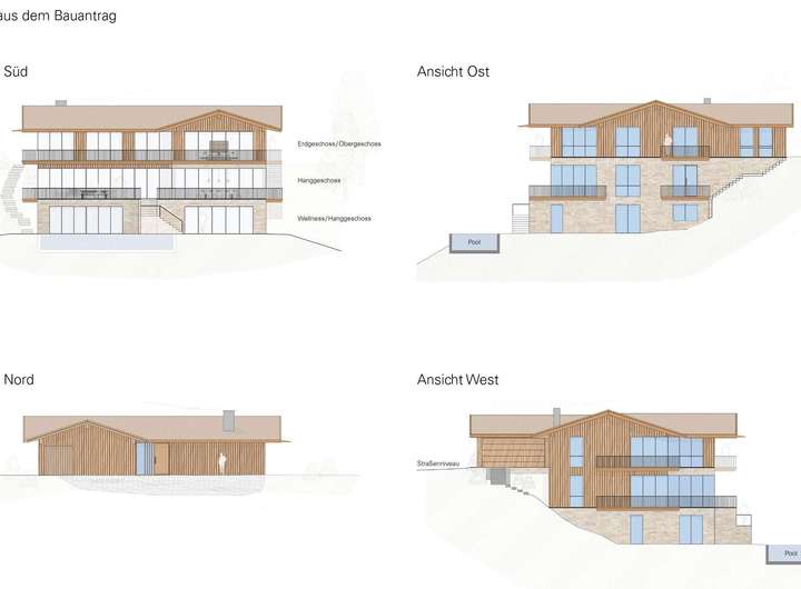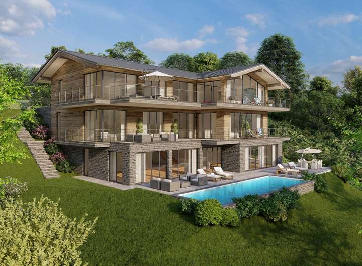 Die aktuelle Planung für ein attraktives Einfamilienhaus mit einer Gesamtfläche von ca. 840 m² und einer Wohnfläche von ca. 634 m² stammt von einem renommierten Tegernseer Architekten. Ein anspruchsvoll geplantes Anwesen mit klar gestalteter Linie bis ins Detail durchdacht. Die Architektur im modern ortstypischen Stil, behutsam in den Hang integriert und zum See und Richtung Berge orientiert. Drei Ebenen in moderner Konzeption. Bereits beim Betreten des Anwesens besticht im ca. 30 m² großen Entrée der freie Weitblick über große Fensterachsen. Hier erschließt sich das Haus über 3 Ebenen über das modern gestaltete Treppenhaus mit Lift. Die Wohnebene, in der Wohnen, Essen und Kochen auf ca. 214 m² Wohnfläche geplant wurden, ist mit einer durchgängigen Fensterfront in Richtung See und Berge orientiert. Über die gesamte Front erstrecken sich beeindruckende Terrassenflächen und einer Frei- treppe zum Terrassenplateau des Hanggeschosses mit Außenpool. Die Hanglage ermöglicht die Positionierung des Baukörpers mit attraktiven Geschossen und traumhaft ausgerichteten Blickachsen. Von jedem Geschoss faszinierende Weitblicke über den Tegernsee auf die umliegende Berglandschaft. Der private Bereich mit Master- Bedroom, Masterbad, Damen- und Herrenankleide ist im Dachgeschoss mit attraktiven Raumhöhen bis unter den Fist geplant worden. Hier befinden sich zwei weitere Schlafzimmer mit jeweils einem eigenen en suite Badezimmer. Jedes Zimmer hat Zugang zu einem schönen Balkon mit grandiosen Ausblicken. Geschickt im Umgang mit den Geländegegebenheiten erstreckt sich das Hanggeschoss mit seinem Terrassenplateau über einen eindrucksvollen Wellness- / Fitnessbereich mit Dampfbad und Sauna. Vorgelagert hierzu ist ein imposanter Pool mit 4 x 12 m Größe und einer SundeckTerrasse geplant worden. Ein höchst erholsames SPA-Feeling ist ganzjährig hier zu genießen. Ausblicke über die großen Panoramafensterflächen sowie von dem 99 m² großen Sundeck sind unverwechselbar und unwiederbringlich. Die derzeitige Planung ist jederzeit auf die persönlichen Wünsche individualisierbar und im Rahmen der örtlichen Gegebenheiten und Gesamtflächen anpassbar.
