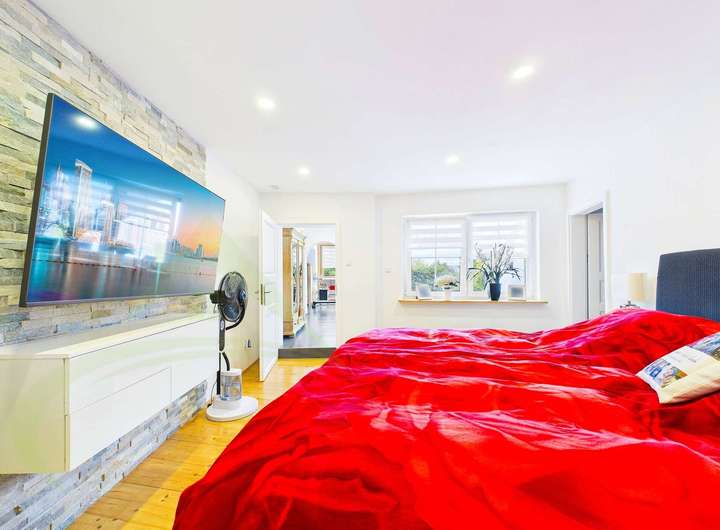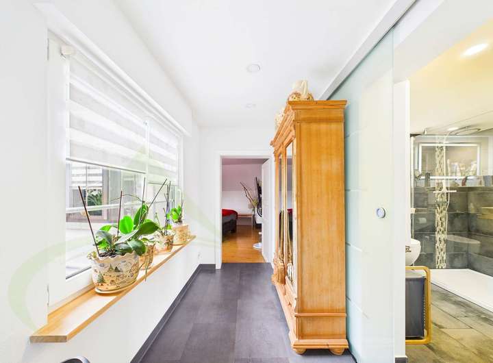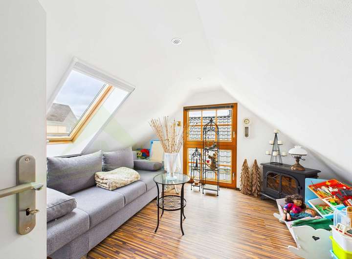 Das ausgebaute Dachgeschoss ergänzt das Raumangebot um weitere liebevoll gestaltete Flächen – ob als Schlafzimmer mit Ankleide oder als Atelier für kreative Köpfe. Im Keller finden sich neben klassischem Stauraum auch Hobby- und Nutzräume, die teilweise wohnlich gestaltet sind – ein idealer Rückzugsort für Heimwerker, Sport oder Musik.