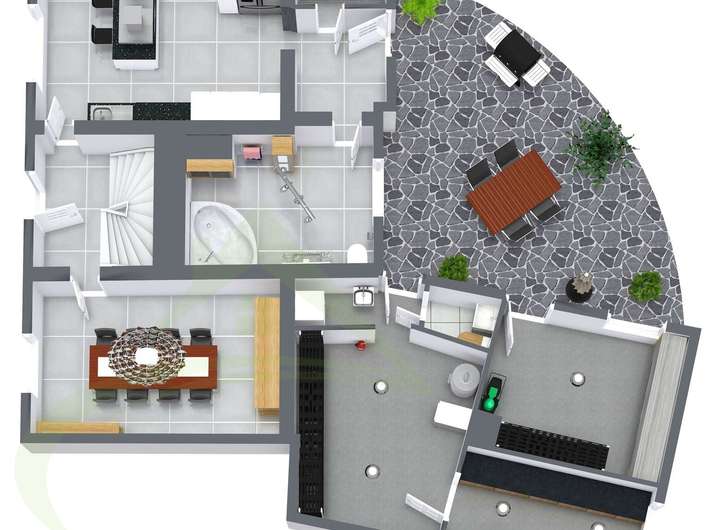 EG: Küche, Abstellraum, Esszimmer, Terrasse, Badezimmer, Heizungsraum, Hobbyraum