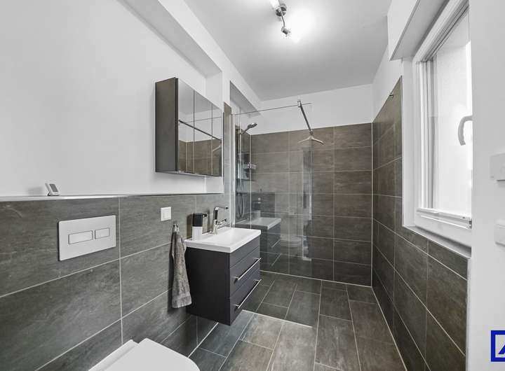 Im Erdgeschoss befindet sich ein großzügiger Wohn- und Essbereich, der dank großer Fensterflächen von Tageslicht durchflutet wird. Die offene Raumgestaltung schafft eine einladende Atmosphäre mit fließenden Übergängen zwischen den Aufenthaltsbereichen. Eine Fußbodenheizung sorgt in allen Wohnräumen für angenehme Wärme und der Kaminofen im Wohnbereich sorgt für Gemütlichkeit. Das Haus verfügt im Erdgeschoss über ein modernes Gästebad mit Dusche und im Obergeschoss über ein geräumiges Bad mit Dusche und Badewanne.