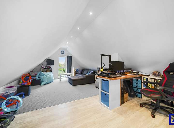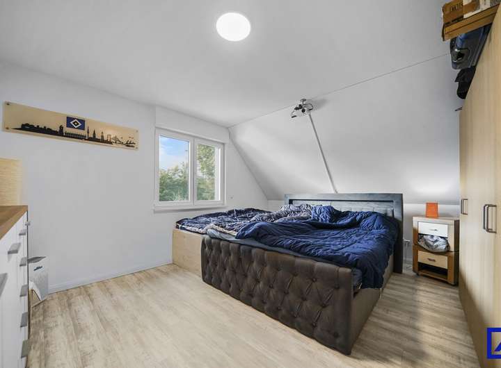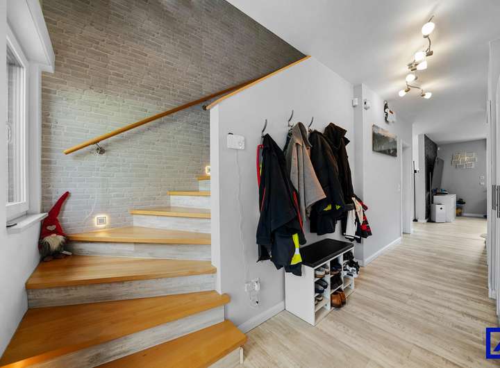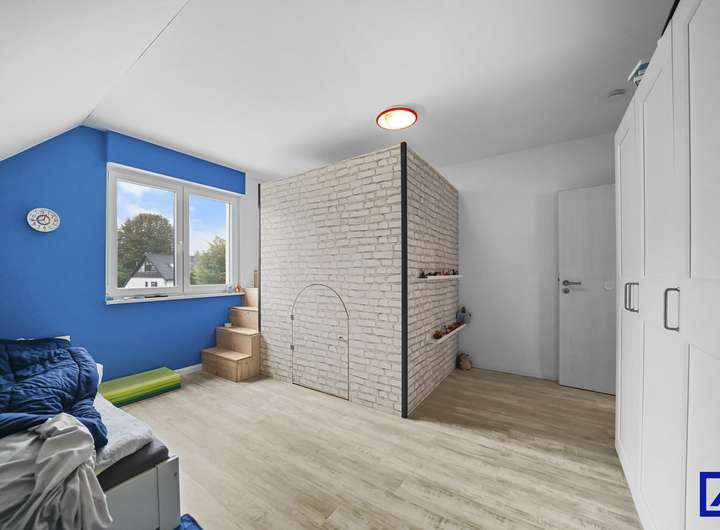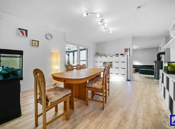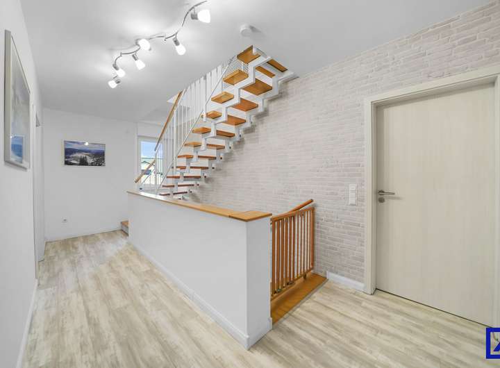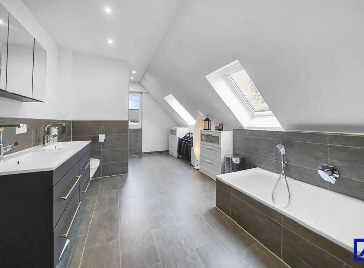 Der Spitzboden ist vollständig ausgebaut und bietet auf rund 20 m² zusätzliche Nutzfläche, die sich ideal als Hobby- oder Arbeitsraum nutzen lässt. Zur Ausstattung gehört eine Garage mit angrenzender Werkstatt, die sowohl vom Hausinneren als auch direkt von der Terrasse aus begehbar ist. Elektrische Rollläden, ein Kaminofen und Smart-Home-Funktionen runden das Angebot ab.