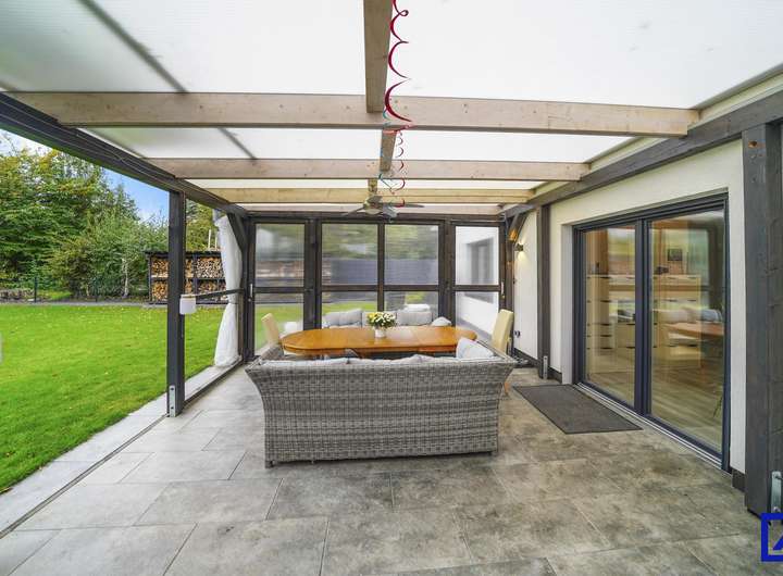 Besonders hervorzuheben ist die großzügige Süd-Terrasse mit einer Fläche von insgesamt ca. 86 m², hiervon sind ca. 28 m² mit einer Terrassenüberdachung sowie einem seitlichen Windschutz versehen. Ein weiteres Highlight ist der weitläufige Garten, der viel Platz für Erholung und Freizeitaktivitäten im Freien bietet. Dieser ist sehr pflegeleicht angelegt und bietet durch mehrere Wasserauslässe ein komfortables Gärtnern.