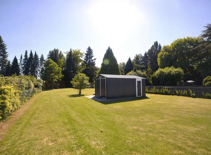 Die Immobilie steht auf einem ca. 1.012 m² großen Grundstück mit großzügigen Gartenflächen, gepflasterten Wegen, mehreren Terrassen sowie einer modernen Metallgarage (Baujahr ca. 2021). Zusätzlich stehen ein Pkw-Stellplatz vor dem Haus sowie ein Holz-Gartenschuppen zur Verfügung.