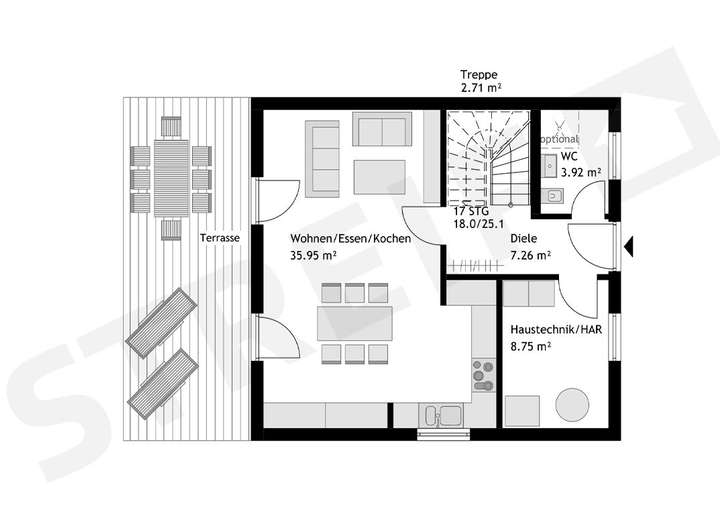 - Treppe aus Buche natur, keilgezinkt und aus eigener STREIF-Produktion (außer bei Bungalow-Grundrissen)