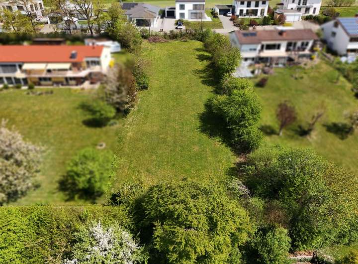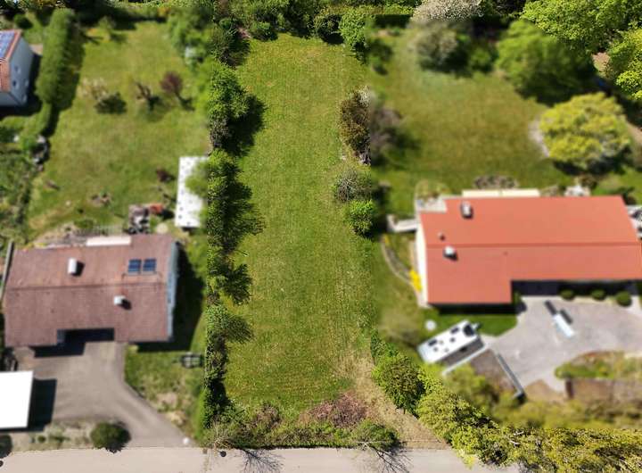 Das Grundstück mit einer Fläche von ca. 1.581 m² genießt eine ruhige Lage und Weitsicht ins Grüne. Dieses Bauland weist weder Baulasten noch Grunddienstbarkeiten auf. Die Erschließungskosten sind bereits vollständig abgerechnet. Der rechtsgültige Bebauungsplan erlaubt auf Grund der Hanglage ein Vollgeschoss und ein vollständiges Gartengeschoss mit einer GRZ (Grundflächenzahl) von 0,2 und einer GFZ (Geschossflächenzahl) von 0,4.
