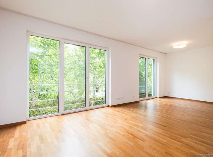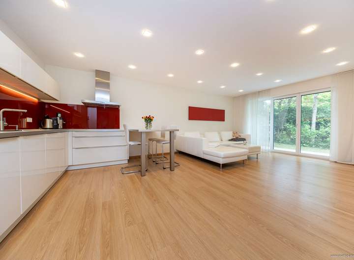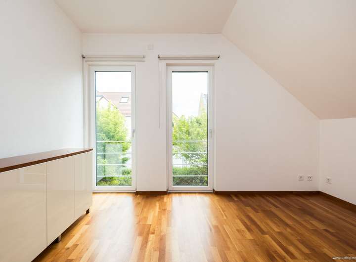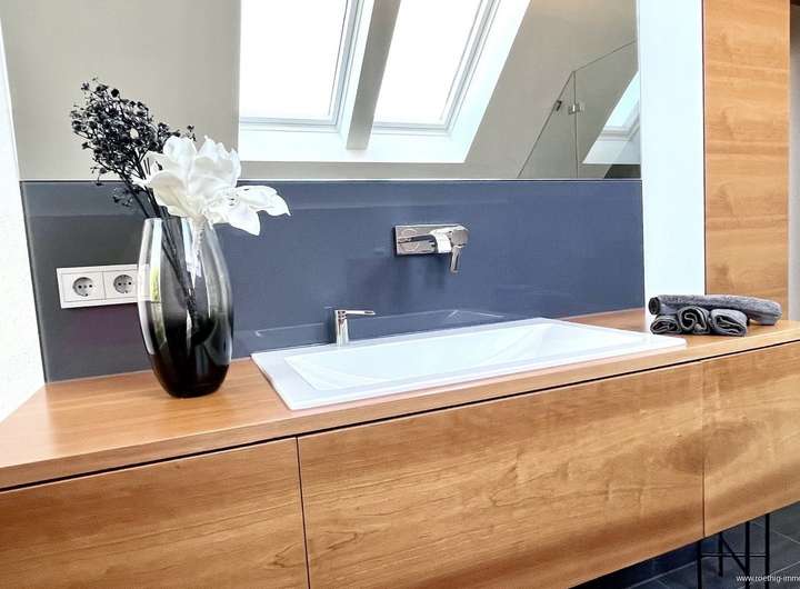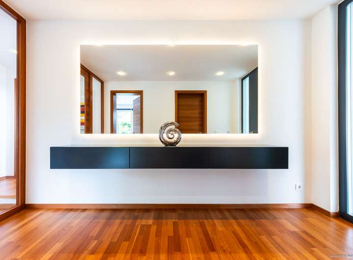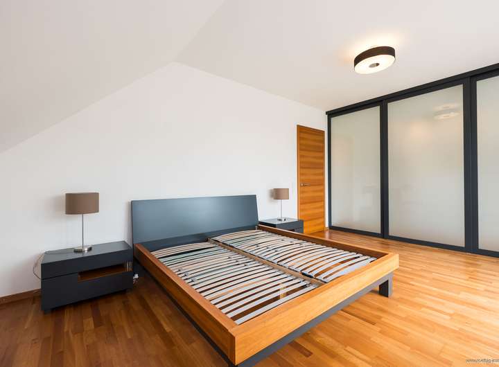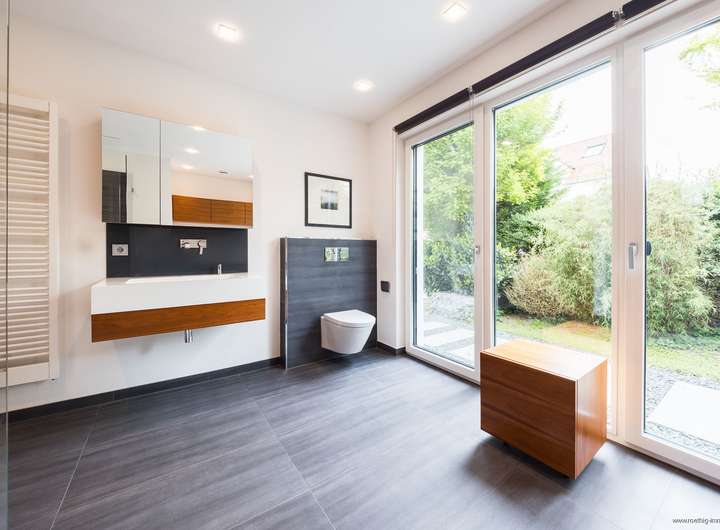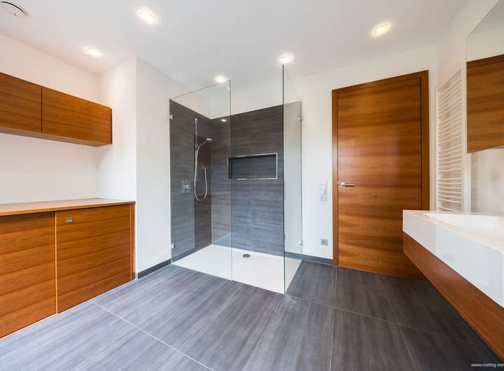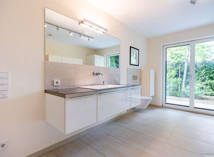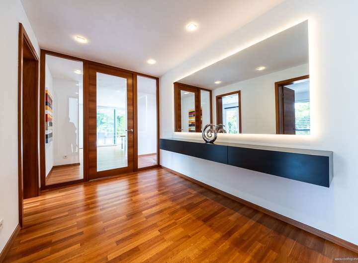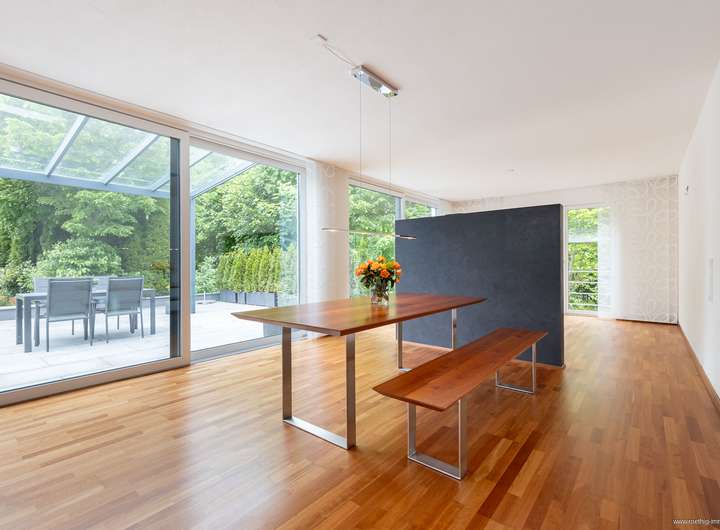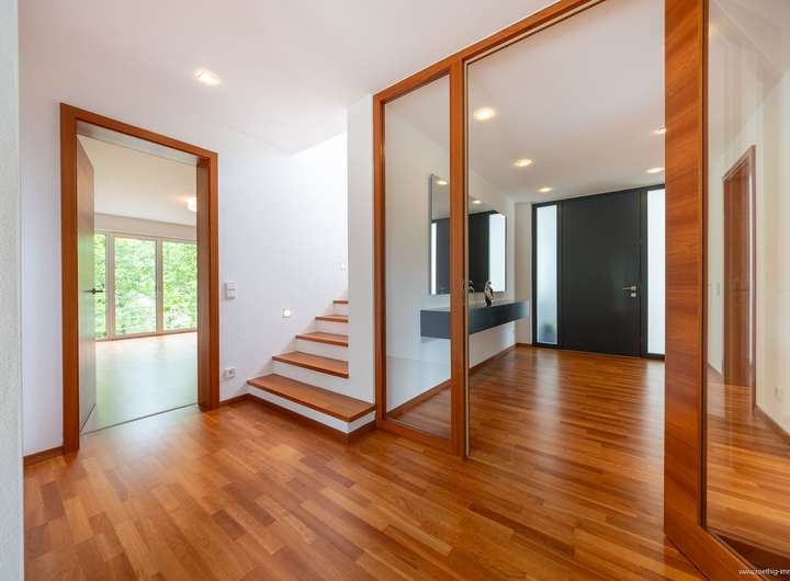 Im gesamten Haus wurde edler Parkettboden sowie stilvolles Feinsteinzeug verlegt. Sämtliche Glasfronten sind dreifach verglast, bodentief und teilweise raumhoch ausgeführt – für maximale Belichtung. Die individuell regulierbare Fußbodenheizung sorgt in allen Räumen für angenehme Wärme. In Küche, Essen und Wohnen wurde zusätzlich eine Wandheizung verbaut. Elektrisch steuerbare Raffstore-Rollläden bieten komfortablen Sonnenschutz im ganzen Haus.