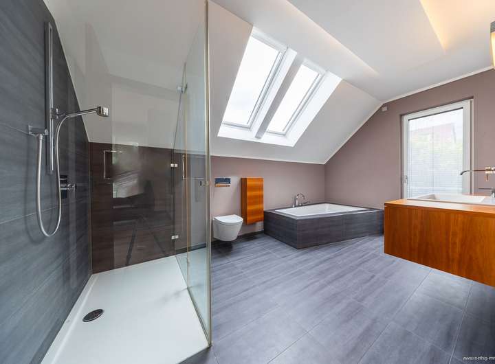 Angrenzend: ein weiteres Kinderzimmer sowie das exklusive Masterbad mit edlem Feinsteinzeug, bodengleicher Dusche, Eckbadewanne, maßangefertigter Waschtischanlage und großzügigen Fensterflächen.