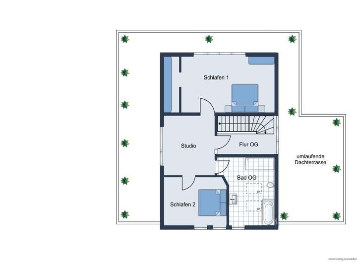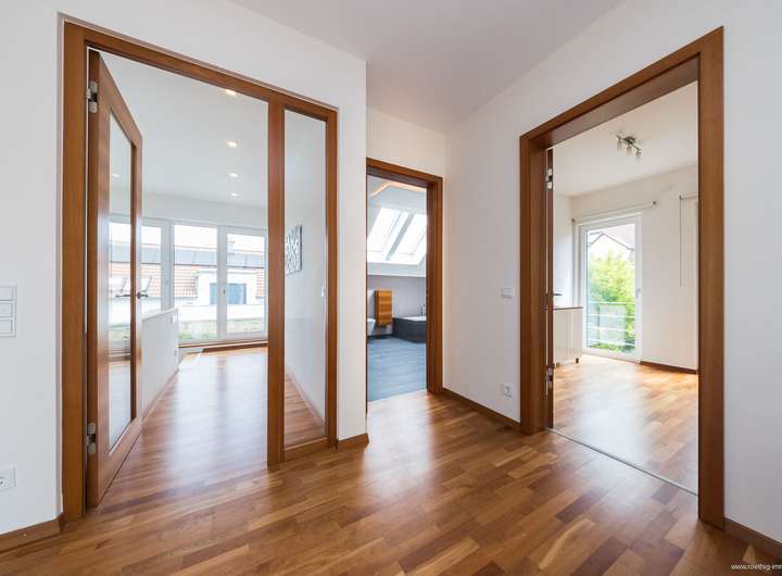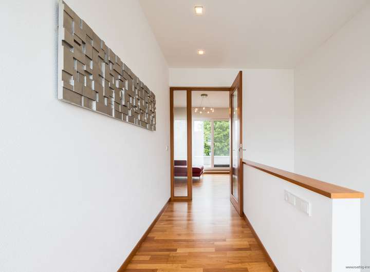 Eine elegante Treppe mit integrierter Beleuchtung führt ins Obergeschoss mit weitläufigem Flur und großzügigem Studiobereich mit ca. 2,78 m Deckenhöhe. Von hier betreten Sie die umlaufende Dachterrasse.