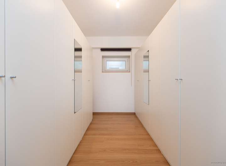 Rechterhand des Studiobereichs liegt das Elternschlafzimmer – Ihr persönlicher Rückzugsort, der durch seine Großzügigkeit und eine ruhige Atmosphäre besticht. Ein begehbarer Kleiderschrank, elegant durch eine raumhohe Schiebetür aus satiniertem Glas zugänglich, bietet viel Stauraum für Ihre Garderobe.