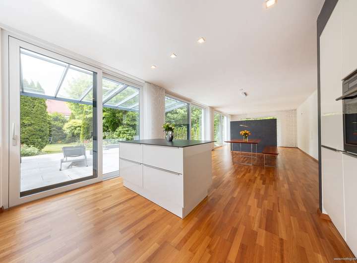 Ein deckenhohes Windfangelement führt in den lichtdurchfluteten Wohn-, Ess- und Küchenbereich – das Herzstück des Hauses. Die exklusive Einbauküche mit großer Insel, harmonischem Essbereich und ca. 12 m langer Glasfront mit drei Schiebetüren öffnet sich zur Süd-West-Terrasse und dem umlaufenden Garten.