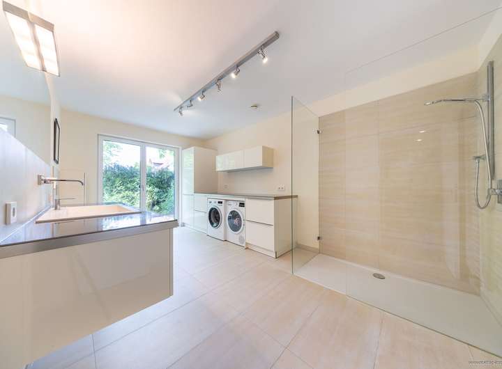 Ergänzt wird das Untergeschoss durch einen Wellnessbereich mit offener Dusche und Platz für Sauna und Fitnessgeräte. Zwei weitere, hochwertig ausgestattete Räume bieten durchdachten Mehrwert und können flexibel genutzt werden. Diese beiden Räume und der Wellnessbereich mit insgesamt 45 m² wurden nicht in die Wohnfläche eingerechnet.
