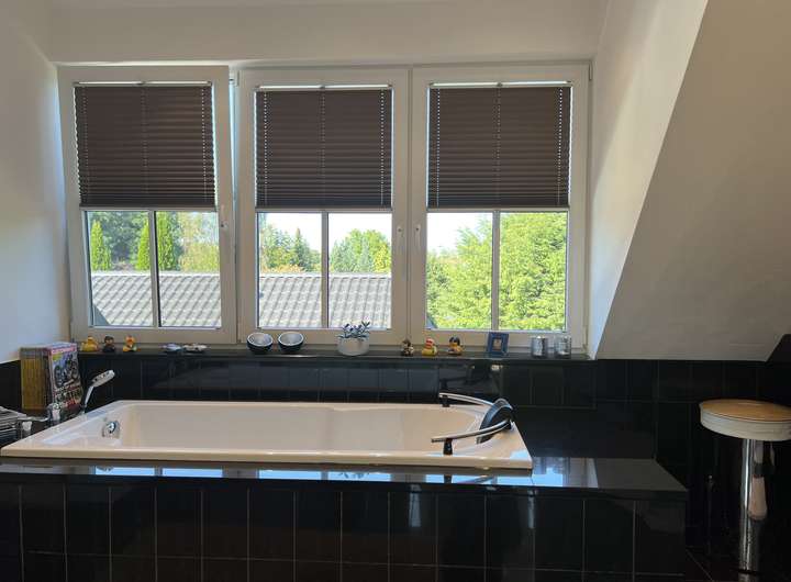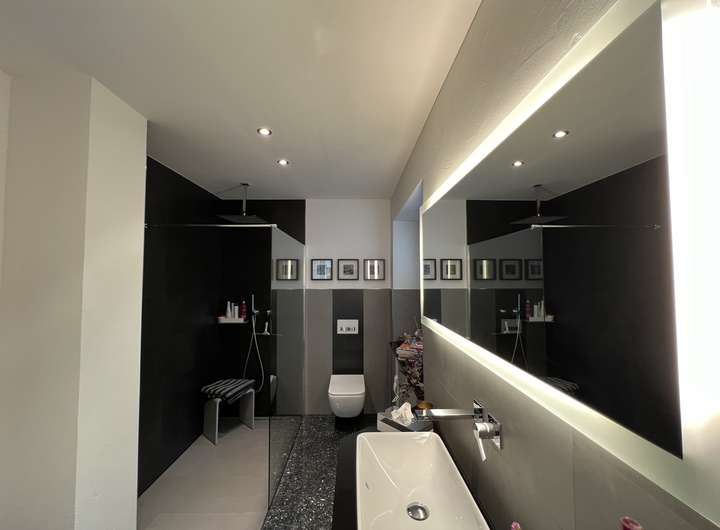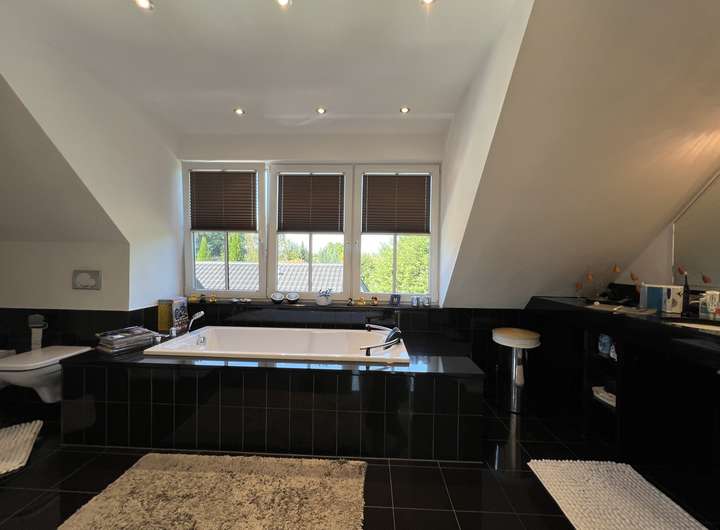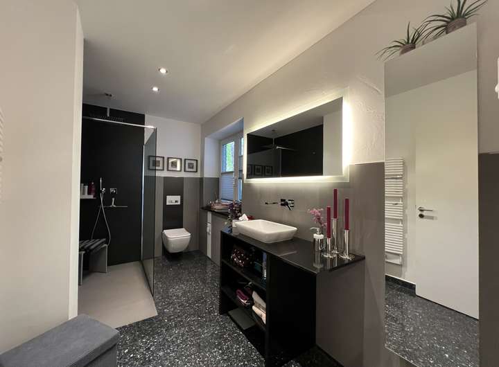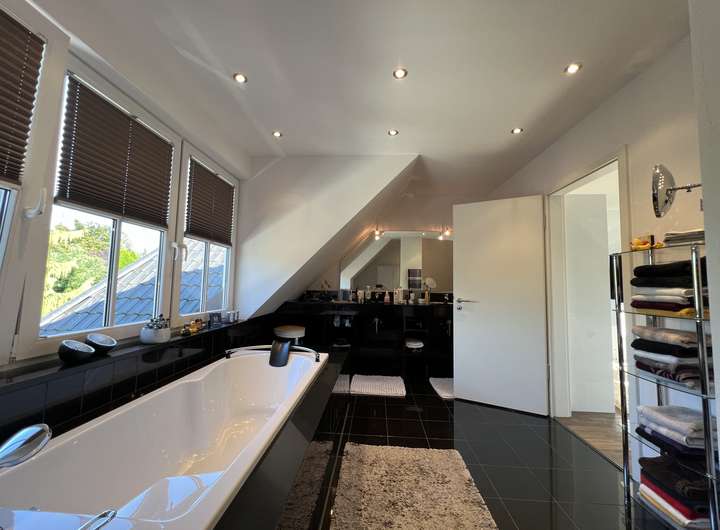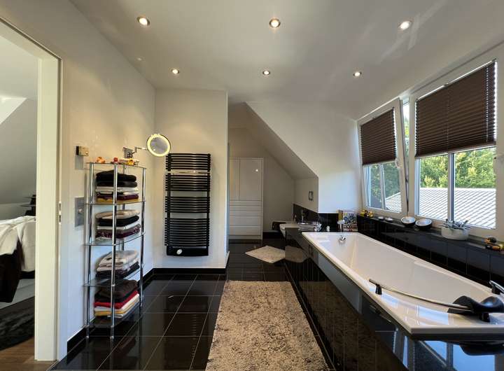 Das Badezimmer im Elternschlafzimmer im OG ist mit Dusche und Badewanne ausgestattet - auch hier nur feinstes Design.