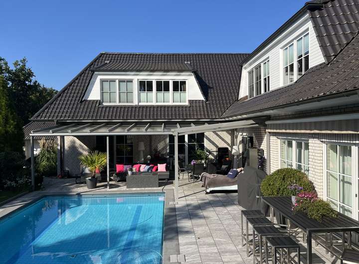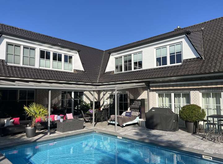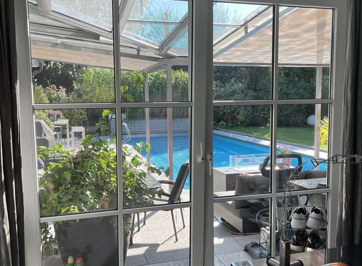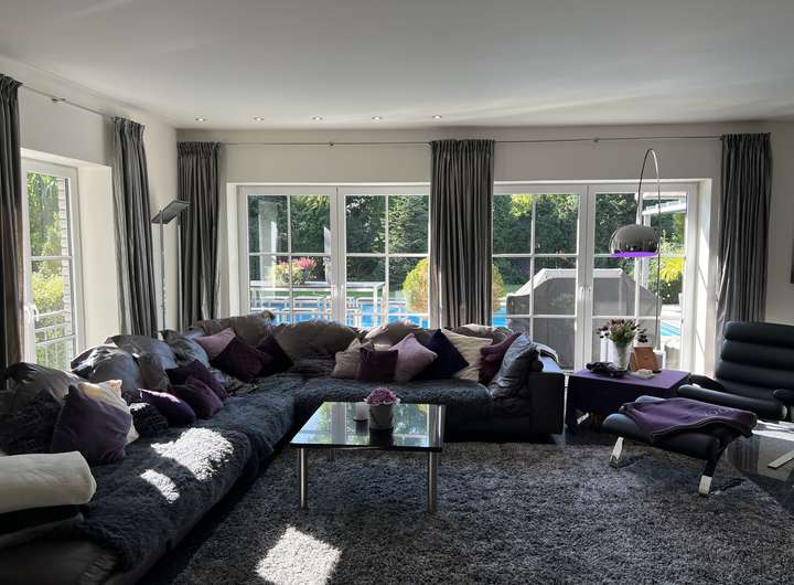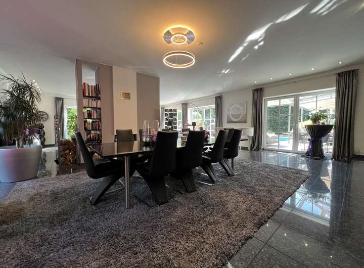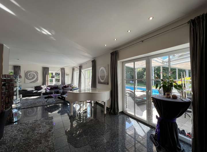Bodentiefe Fenster- und Türelemente im Wohnbereich, sowie zahlreiche Fenster im OG/DG sorgen für eine lichtdurchflutete Atmosphäre und bieten einen herrlichen Blick in den Garten, die Terrassen & die Pool-Zone.