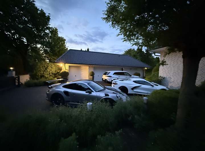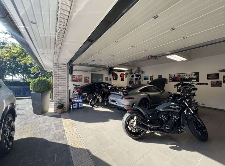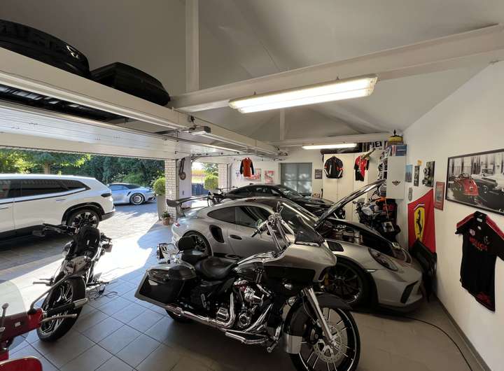 Ein imposantes Garagenhaus bietet Platz für PKWs & Motorräder - ein weiterer Nebenraum ist hier auch als Lager oder Werkstatt eingebracht worden - die Optik ähnelt fast einem Wohnhaus. Zudem sind weitere Parkmöglichkeiten direkt vor der Garage und dem Haus vorhanden, so dass die Autosammlung auch genügend Platz findet.