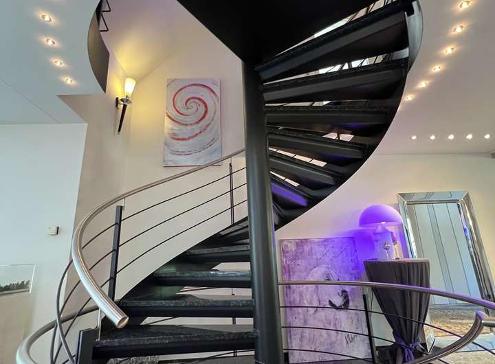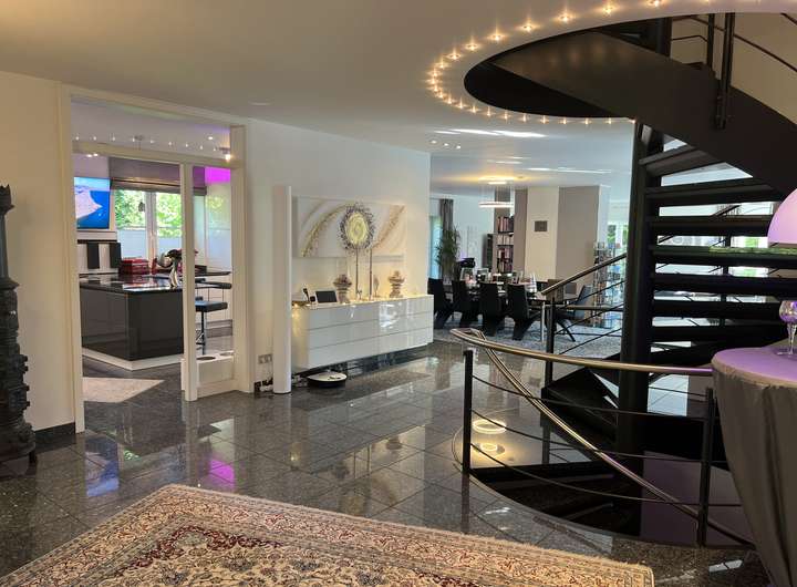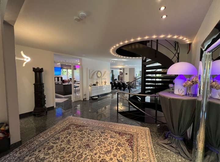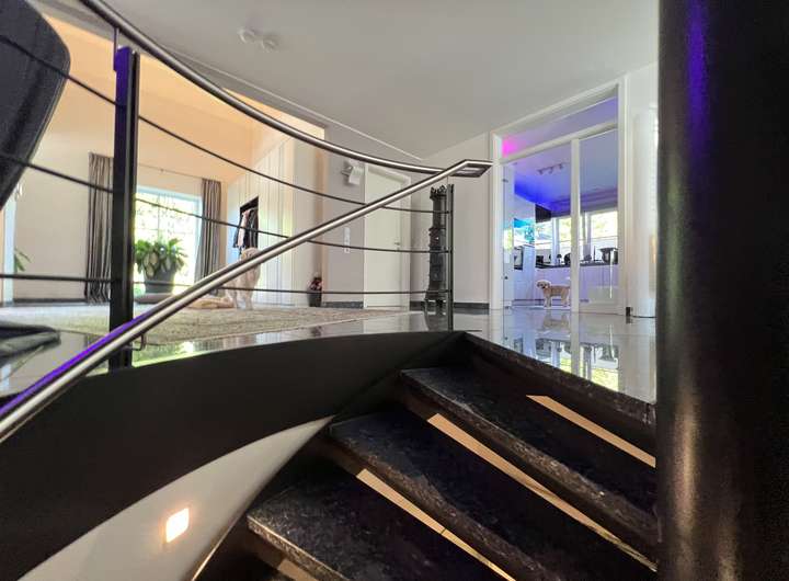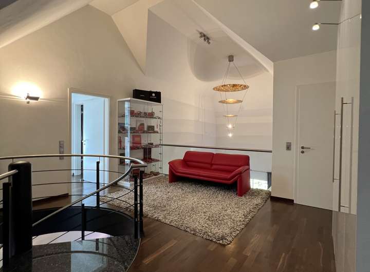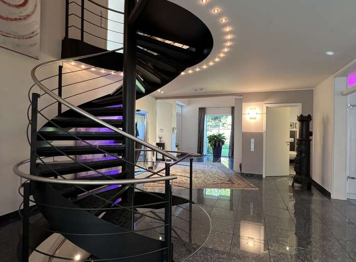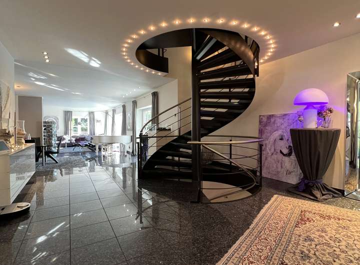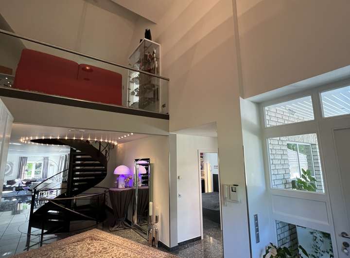 Beim Betreten des Hauses empfängt Sie eine beeindruckende, helle & hohe Eingangshalle mit Blick zur offen gestalteten Galerie des Obergeschosses, in welches Sie über eine phänomenale gewendelte Treppe in wertiger Stahlkonstruktion gelangen dürfen.
