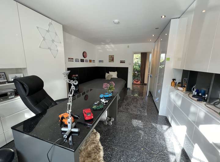 Vom Erdgeschoss seitlich ausgehend befindet sich ein separater Bereich mit Flur, Schlafzimmer & Büro/ Office (zweites Schlafzimmer möglich) und gegenüberliegend ein modernes, erneuertes Badezimmer.