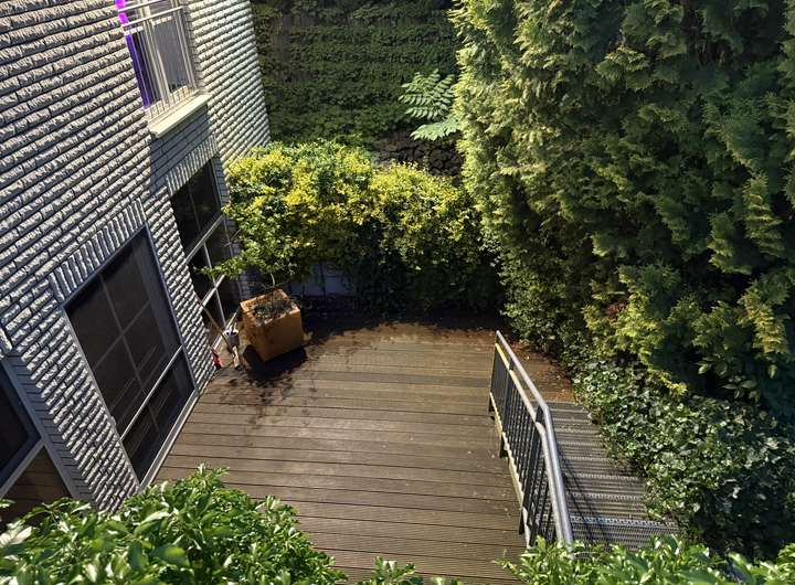 Die Rasenfläche verfügt über eine automatische Bewässerungsanlage, ein Beleuchtungskonzept und dem beliebten Rasen-Roboter.