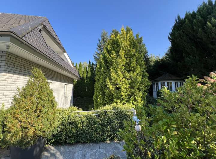 Das Anwesen bietet einen ruhigen Rückzugsort dank hoher Hecken, einem massiven, neu angefertigten Zaun, der Toranlage zur Einfahrt auf das Grundstück und dem Garagenhaus mit Nebenraum - die Privatsphäre wahren, ohne die Offenheit zur Natur zu verlieren.