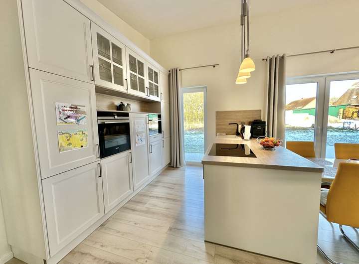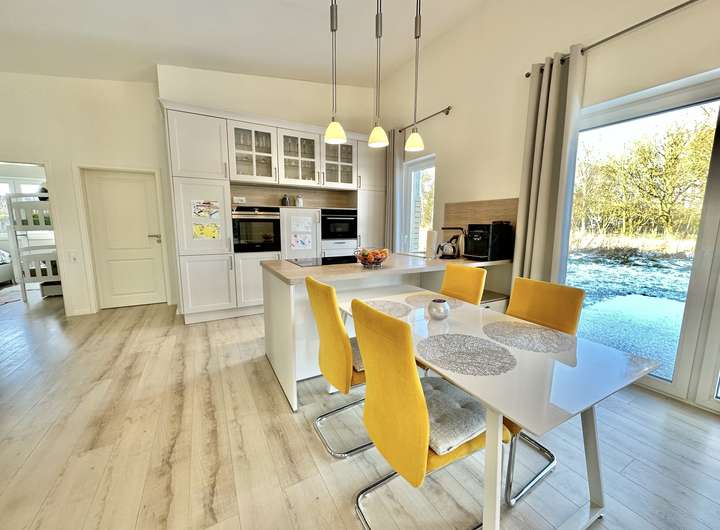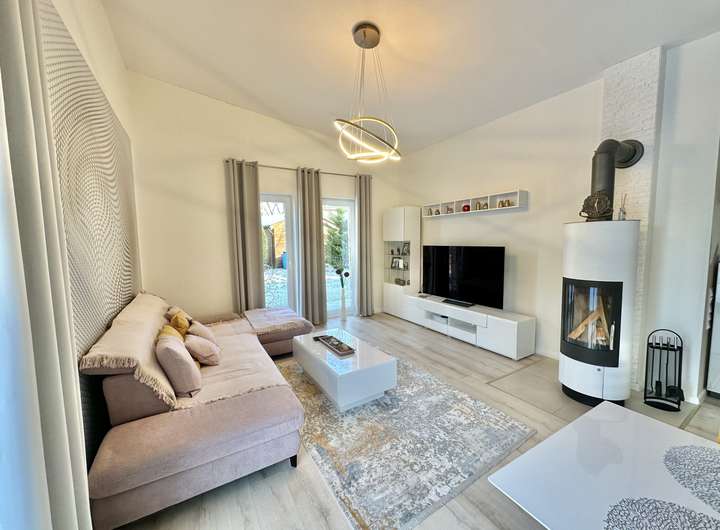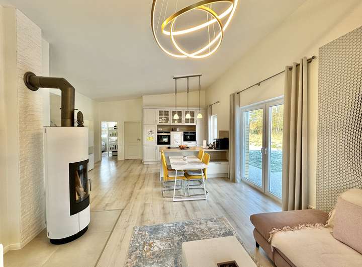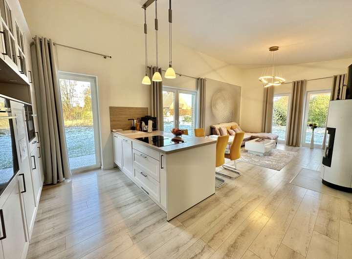 Dieser stilvolle Bungalow bietet auf 103 qm Wohnfläche eine durchdachte Raumaufteilung, die für ein großzügiges und einladendes Ambiente sorgt. Der offene Wohn- und Essbereich, verbunden mit einer modernen Küche, hohen Decken und einem frei stehenden Kamin, schafft eine Atmosphäre luxuriöser Gemütlichkeit. Drei geschmackvoll gestaltete Schlafzimmer bieten erstklassige Rückzugsorte. Das elegante Badezimmer ist mit einer Badewanne und separater Dusche ausgestattet, während ein zusätzlicher Hauswirtschaftsraum mit WC und Waschbecken für maximalen Komfort sorgt.