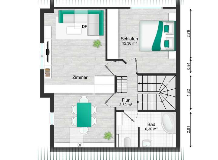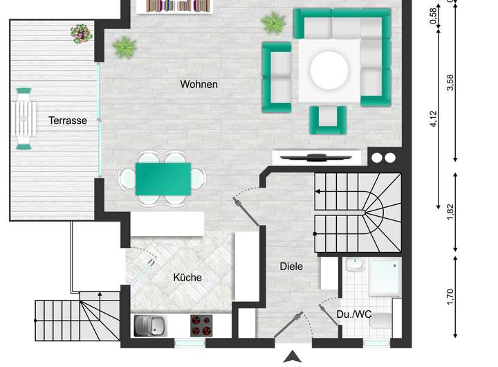 Im Erdgeschoss ist neben der Eingangstür ein Gäste-WC mit Dusche.
