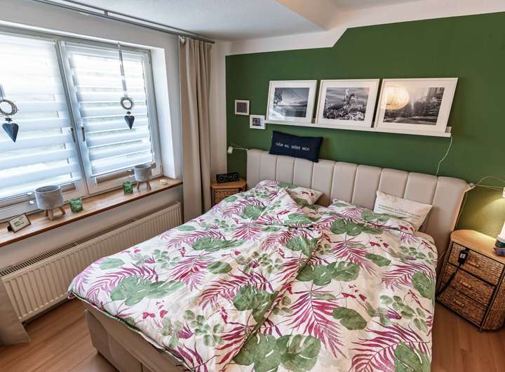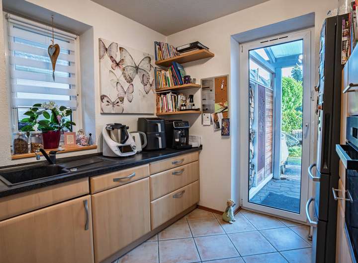 Die Doppelhaushälfte umfasst insgesamt vier Zimmer, darunter ein Badezimmer im OG und einem Duschbad im Erdgeschoss. Die Räumlichkeiten sind hell und freundlich gestaltet und bieten vielfältige Gestaltungsmöglichkeiten. Die Einbauküche bietet mit der gutdurchdachten und halboffenen Anordnung viel Platz für alle Küchenutensilien und Geschirr. Ein direkter Zugang zum Garten ist von der Küche sowie auch vom Wohnzimmer möglich.