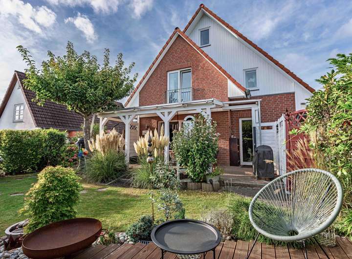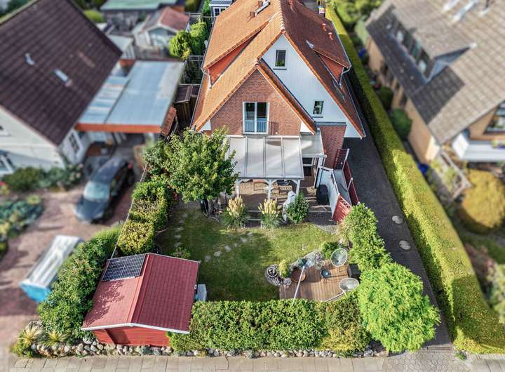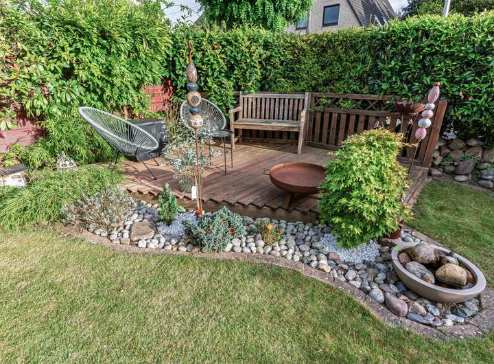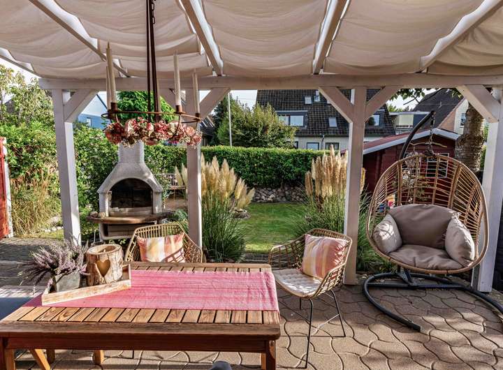 Die wunderschöne überdachte Terrasse lädt Sie zum Entspannen im Freien ein. Im Garten finden Sie eine kleine Freiterrasse aus Holz auf der Sie ebenfalls die Seele baumeln lassen können. Ein Gartenhäuschen lässt alle Gartengeräte und Fahrräder aus dem Sichtfeld verschwinden.