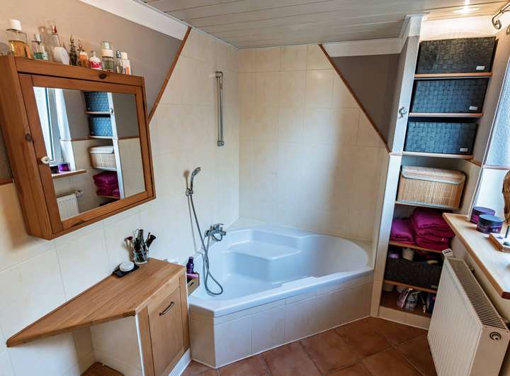 Im Obergeschoss liegen 3 Zimmer und das Badezimmer mir Eckbadewanne, von dort haben Sie die Möglichkeit Ihre Wäsche über das Wäschefallrohr direkt in den Waschkeller zu befördern.