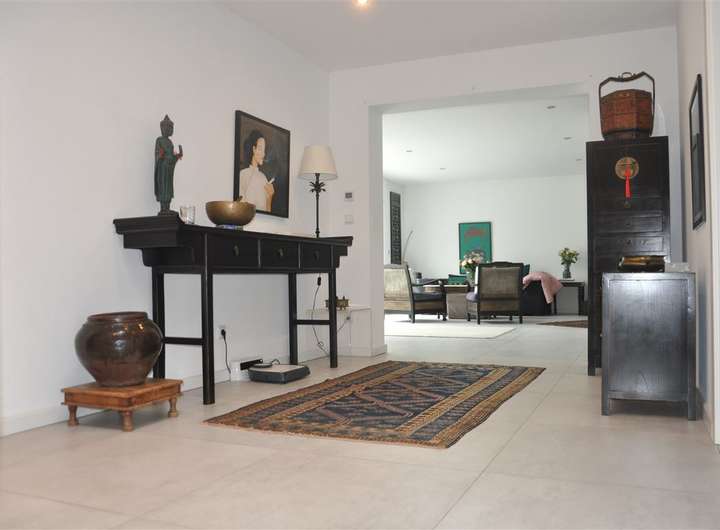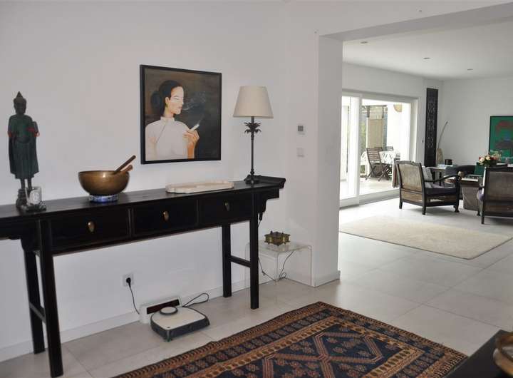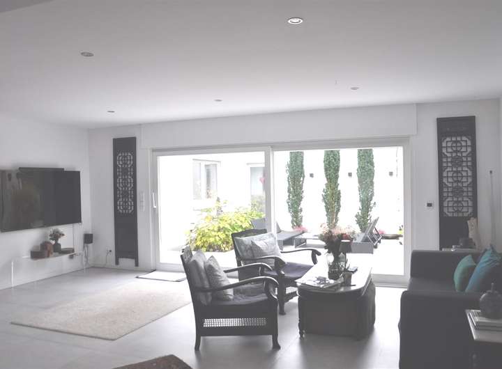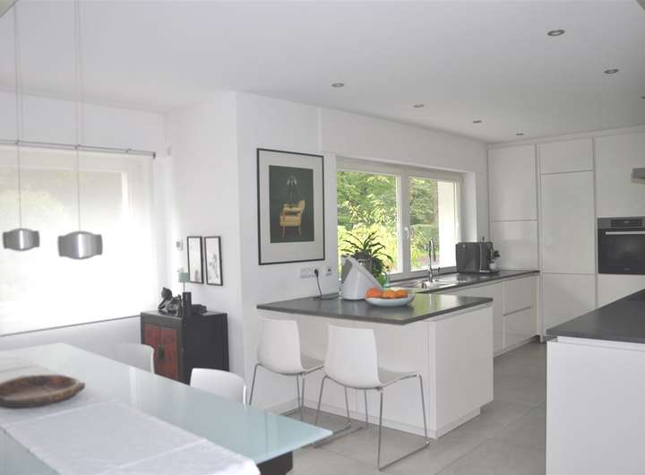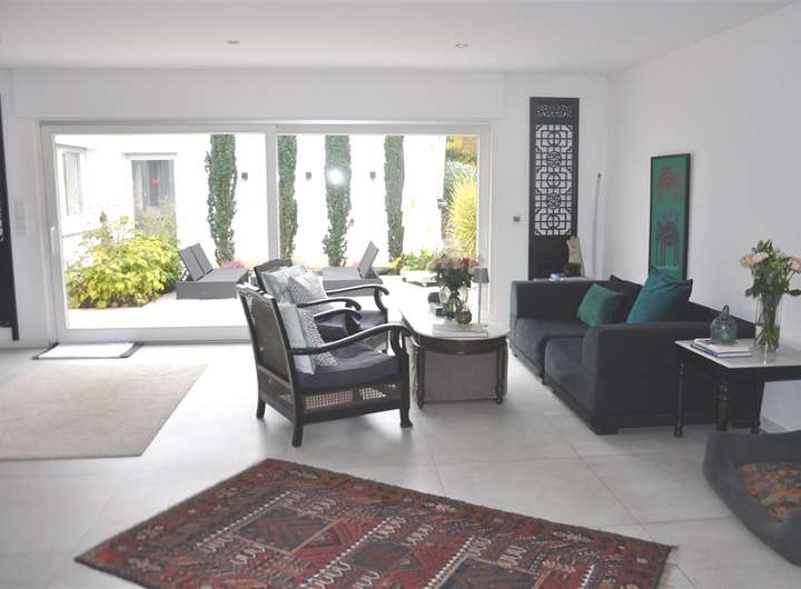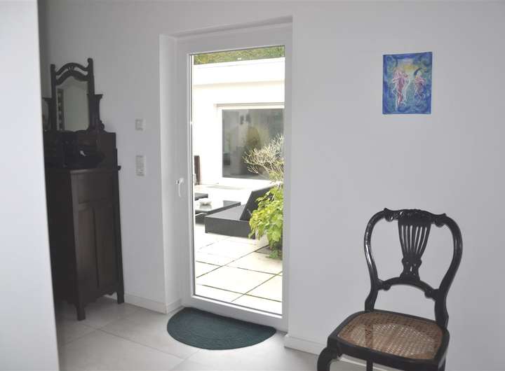 Bereits beim Betreten des exklusiven Eigenheims beeindruckt das lichte, offene Entrée mit direktem Zugang zum großzügigen, offenen Wohn-/Küchen-/Essbereich: der L-förmige Zuschnitt mit seinen großflächigen bodentiefen Fensterelementen als Hebe-Schiebe-Anlage gibt unmittelbar den Blick frei auf das blickgeschützte Atrium mit Lounge-Bereich und den seitlichen Zugang zum gartenarchitektonisch liebevoll gestalteten Außenbereich.