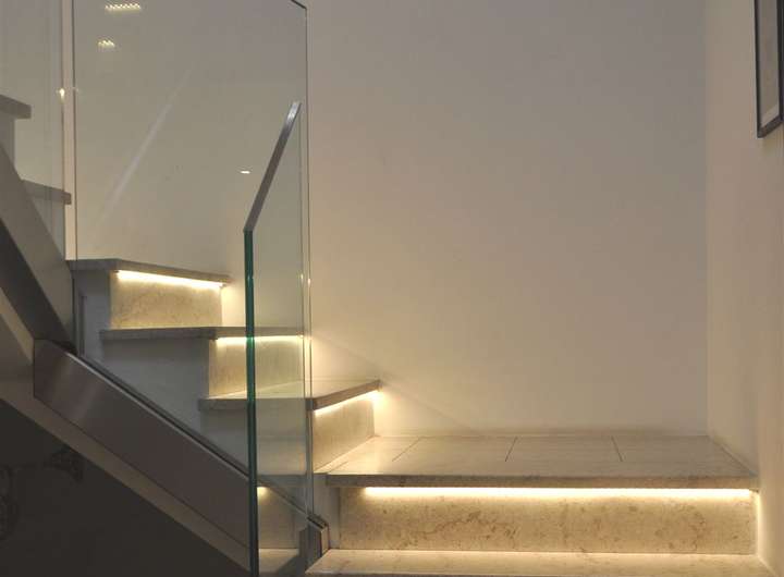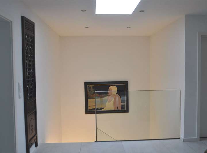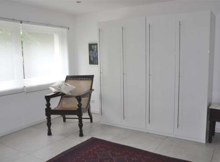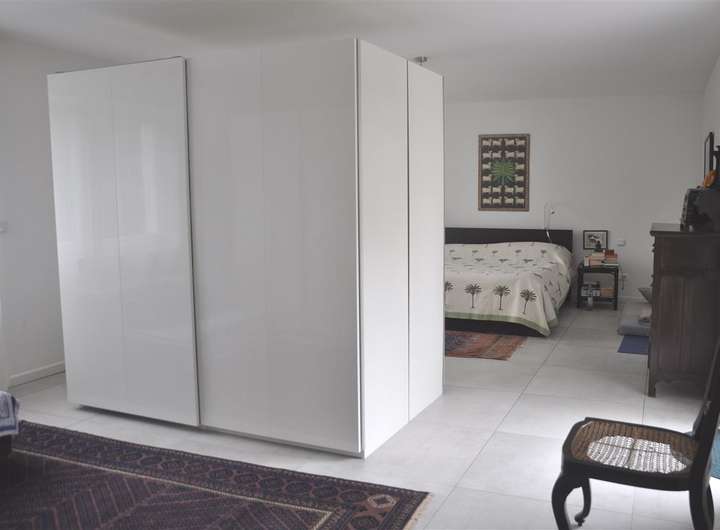Im Seitentrakt befindet sich der Elternschlafbereich mit integrierter Ankleide und Masterbad sowie eigenem Zugang zum innenliegenden Atrium.