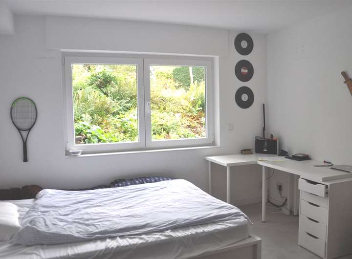 Im wohnwertigen, mit großen Fenstern ausgestatteten Gartengeschoss befinden sich zwei große Räume mit vorgelagerter Terrasse und ein Duschbad.