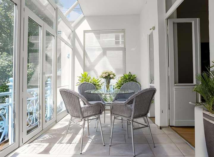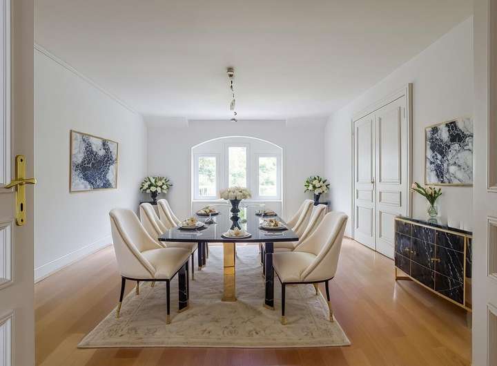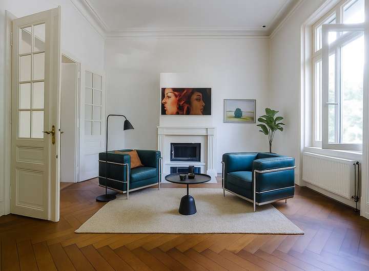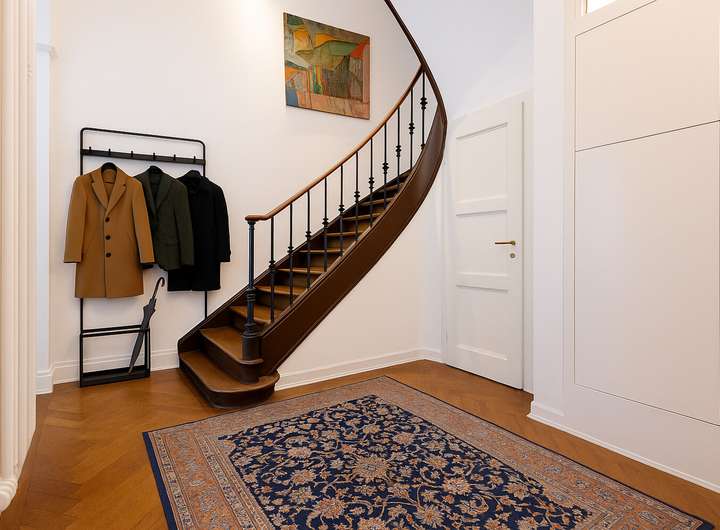 Auf einer Wohnfläche von circa 330 m² und einem Grundstück von circa 215 m² bietet das Einfamilienhaus insgesamt elf großzügige Zimmer und zwei Wintergärten, welche sich über mehrere Etagen verteilen. Zahlreiche große Sprossenfenster sorgen für lichtdurchflutete Räume. Zwischen 1999 und 2002 wurde das Gebäude umfassend umgebaut und modernisiert. Dabei wurden die historischen Stilelemente jedoch mit großer Sorgfalt bewahrt: Hohe Decken mit edlen Stuckelementen in einzelnen Wohnräumen, historische Parkettböden im klassischen Fischgrätmuster und eine repräsentative Holztreppe prägen den eleganten Altbau-Charakter. Edle Rundbögen und Flügeltüren verbinden die Räumlichkeiten miteinander.