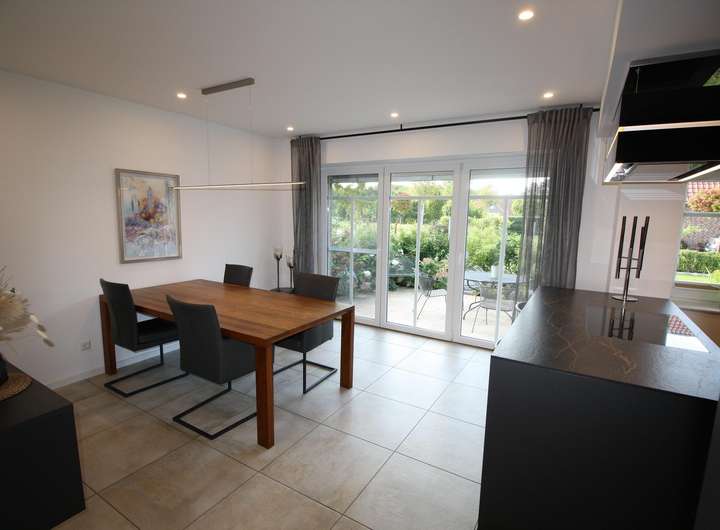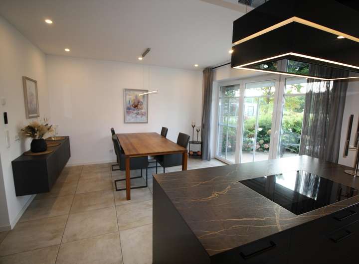Küche: Die moderne Küche ist ein Highlight dieses Hauses. Sie ist voll ausgestattet mit modernen Küchengeräten, Kochinsel, etc. Die große Fensterfront ermöglicht einen direkten Zugang zur Terrasse, welche sich in Kombination mit der angrenzenden Küche ideal für Grillabende eignet.