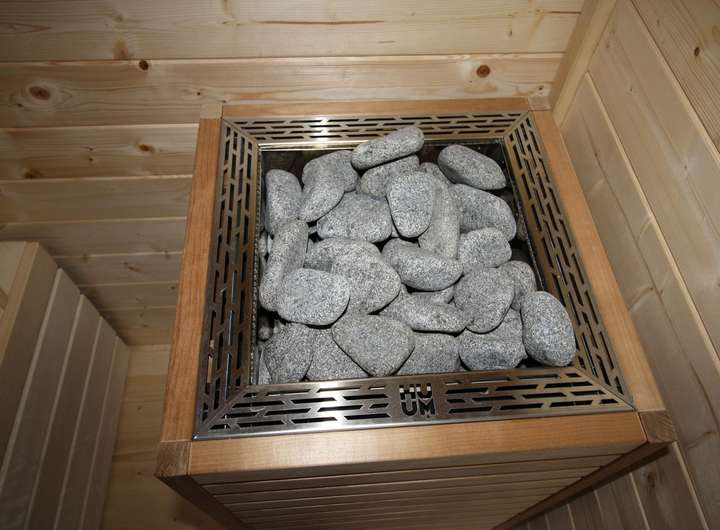 Sauna: Außensauna in massiver Blockbohlenbauweise mit Vorraum. Hochwertiger Saunaofen mit 10 kW von HUUM + Steuerung.