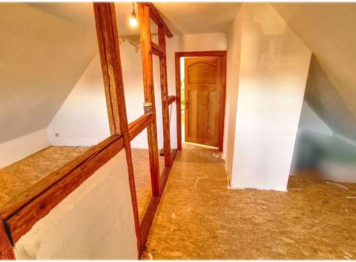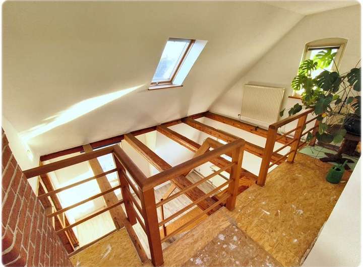 Im Obergeschoss erwartet Sie eine charmante Maisonettewohnung, die sich über zwei Ebenen erstreckt. Im ersten Obergeschoss genießen Sie einen weitläufigen offenen Wohn-, Ess- und Küchenbereich, der durch das offen sichtbare Fachwerk besondere Akzente setzt. Des Weiteren finden Sie hier ein Schlafzimmer sowie ein modernes Badezimmer mit sowohl Dusche als auch Badewanne. Über eine offene Holztreppe gelangen Sie zur Galerie im Dachgeschoss, die einen Blick auf den ersten Stock und gegenüber in die Feldmark bietet. Auf dieser Ebene steht Ihnen ein großer Raum (mit offenem Fachwerk geteilt) zur individuellen Nutzung zur Verfügung. Die Treppenhausebene könnte zudem in ein zusätzliches Zimmer umgewandelt werden.