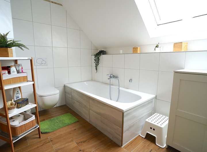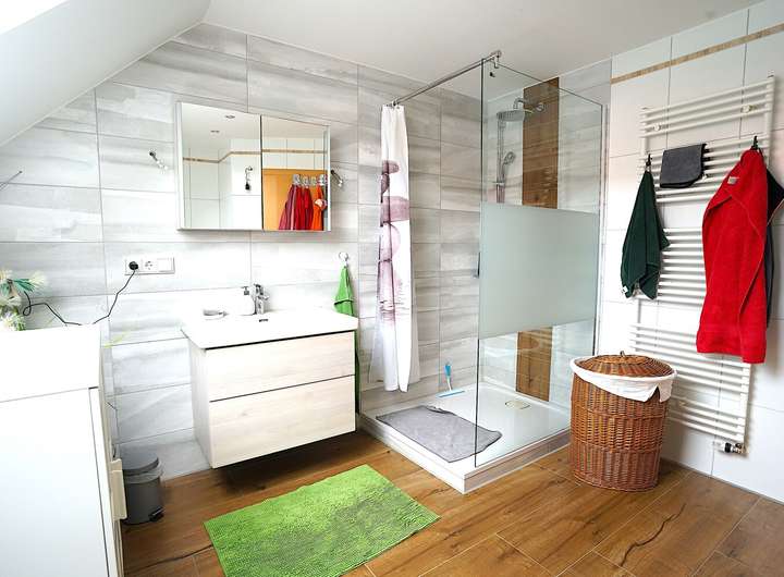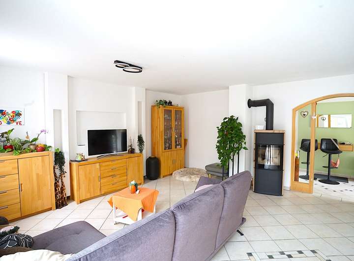 Hochwertige Fliesen-, Vinyl- und Laminatböden verleihen jedem Raum einen modernen Akzent. Ergänzt wird dies durch einen eleganten Kaminofen, der besonders in der kühleren Jahreszeit eine angenehme Atmosphäre schafft.