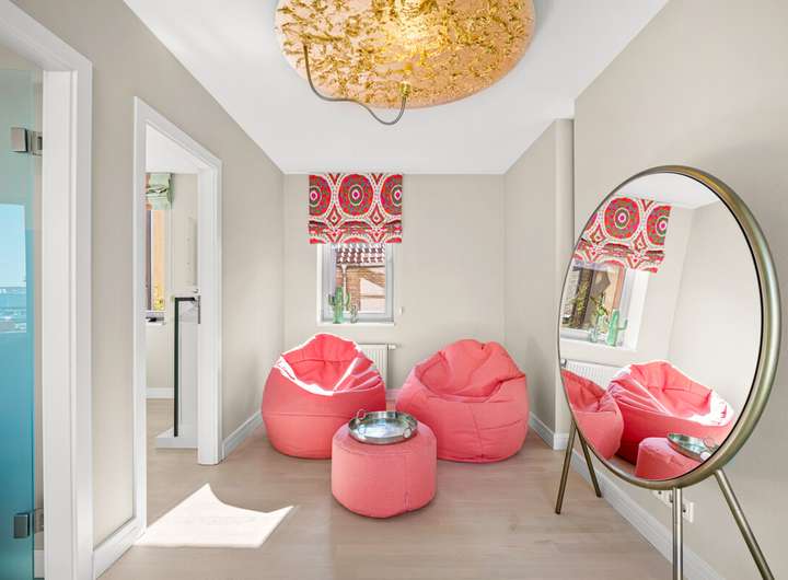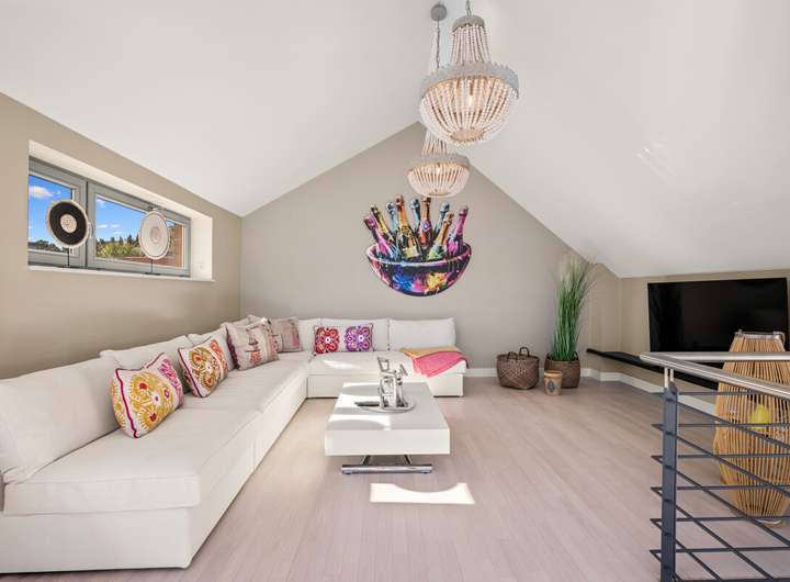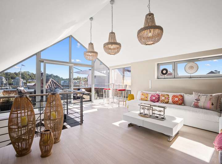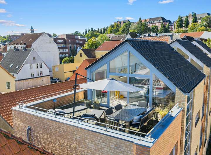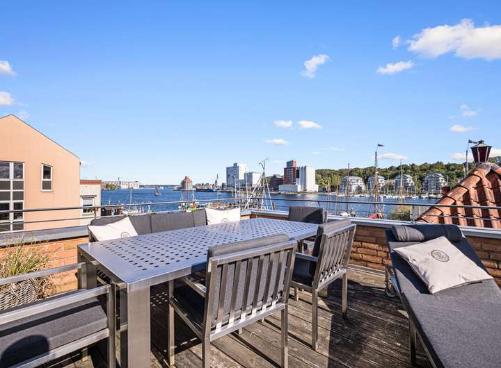 Das Staffelgeschoss bildet das eindrucksvolle Highlight des Hauses. Hier lädt ein stilvoll gestaltetes Wohnzimmer mit weiten Fensterfronten zum Verweilen ein und bietet den Zugang zur traumhaften Dachterrasse. Von dort eröffnet sich ein spektakulärer Blick über den Hafen, die Förde und die Dächer der Altstadt. Ein Panorama, das zu jeder Tageszeit begeistert und den besonderen Charakter dieser Immobilie unterstreicht.