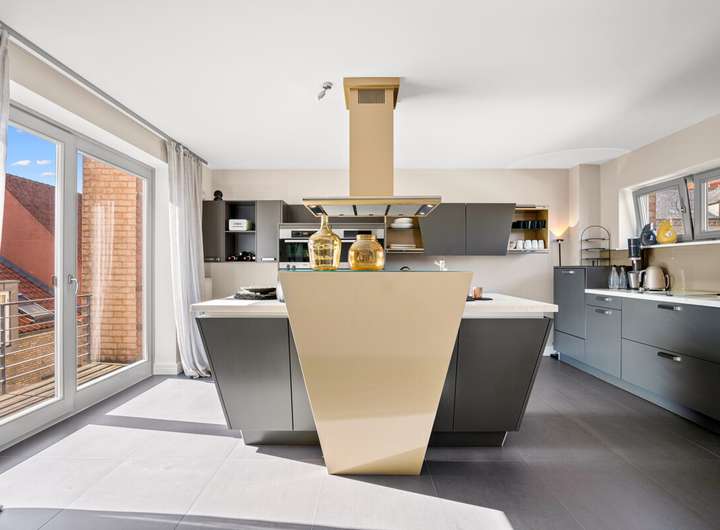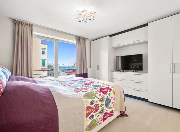 Auf der nächsten Ebene öffnet sich der weitläufige Wohn- und Essbereich mit einer hochwertigen, offen gestalteten Küche und Zugang zu einem Balkon, der zum ruhigen Innenhof ausgerichtet ist. Großzügige Fensterflächen sorgen für ein lichtdurchflutetes Ambiente und bieten zur Wasserseite einen wunderbaren Blick über den Hafen und die Förde.